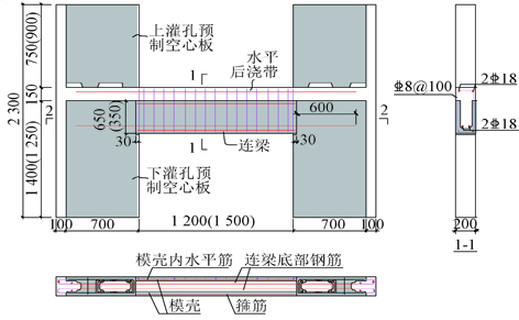 装配式空心板剪力墙结构的叠合连梁由预制U形混凝土模壳、模壳内后浇混凝土及水平后浇带组成。为研究其抗震性能,完成了3种跨高比、底部纵筋在墙肢内2种锚固方式并按“强剪弱弯”设计的5个连梁试件的拟静力试验,其中,跨高比为1.5和3.0的连梁试件各2个,跨高比为2.4的连梁试件1个,3个试件连梁底部纵筋锚固板锚固,2个试件连梁底部纵筋直线锚固。试验结果表明:预制U形模壳与后浇混凝土整体共同工作;达到峰值弯矩前,连梁纵筋屈服,箍筋未屈服,连梁与墙肢结合面开裂和滑移;加载结束时,连梁角部混凝土压坏、剥落;连梁为弯曲滑移破坏,但跨高比为1.5和2.4的连梁表面布满斜裂缝,跨高比为3.0的连梁的斜裂缝分布在两端约500mm高度范围内;连梁梁端弯矩-转角滞回曲线捏拢,耗能能力较差;连梁极限转角为1/40~1/28,具有很好的弹塑性变形能力;底部纵筋在墙肢内的锚固方式对连梁的抗震性能基本没有影响;连梁顶部纵筋受拉与底部纵筋受拉时的受弯承载力分别为按GB 50010—2010《混凝土结构设计规范》中的正截面受弯承载力公式计算值的1.10~1.34倍和1.13~1.37倍,可采用GB 50010—2010《混凝土结构设计规范》的公式计算叠合连梁的受弯承载力。